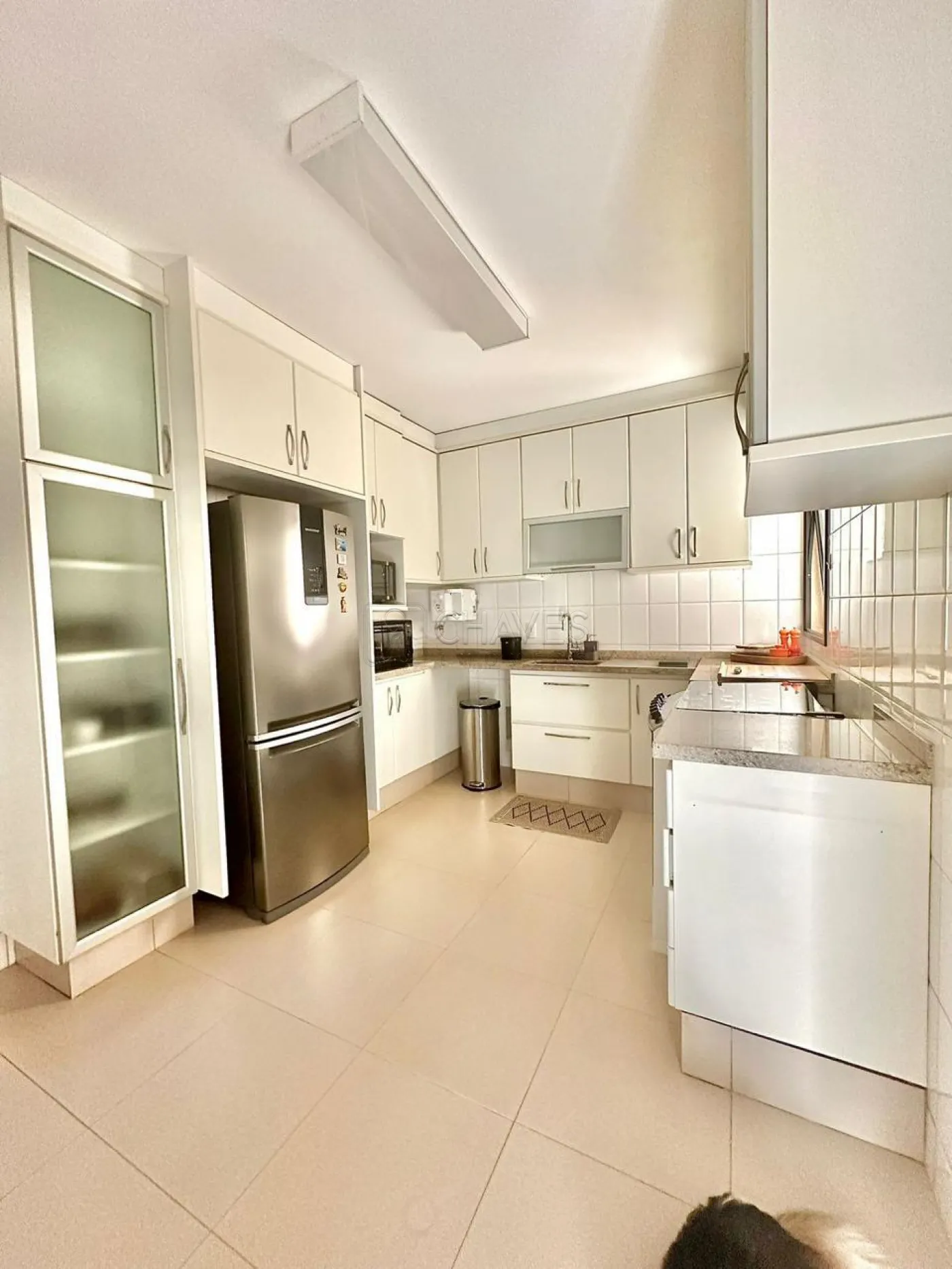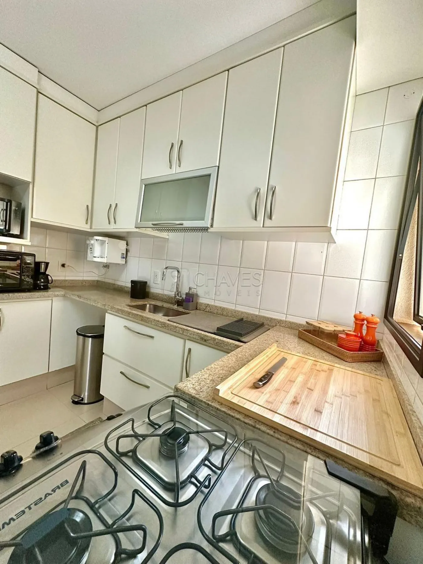 -Cozinha equipada com armários e eletrodomésticos: micro-ondas, geladeira, frigobar, cervejeira, fogão, cafeteira, pratos, xícaras, copos e taças