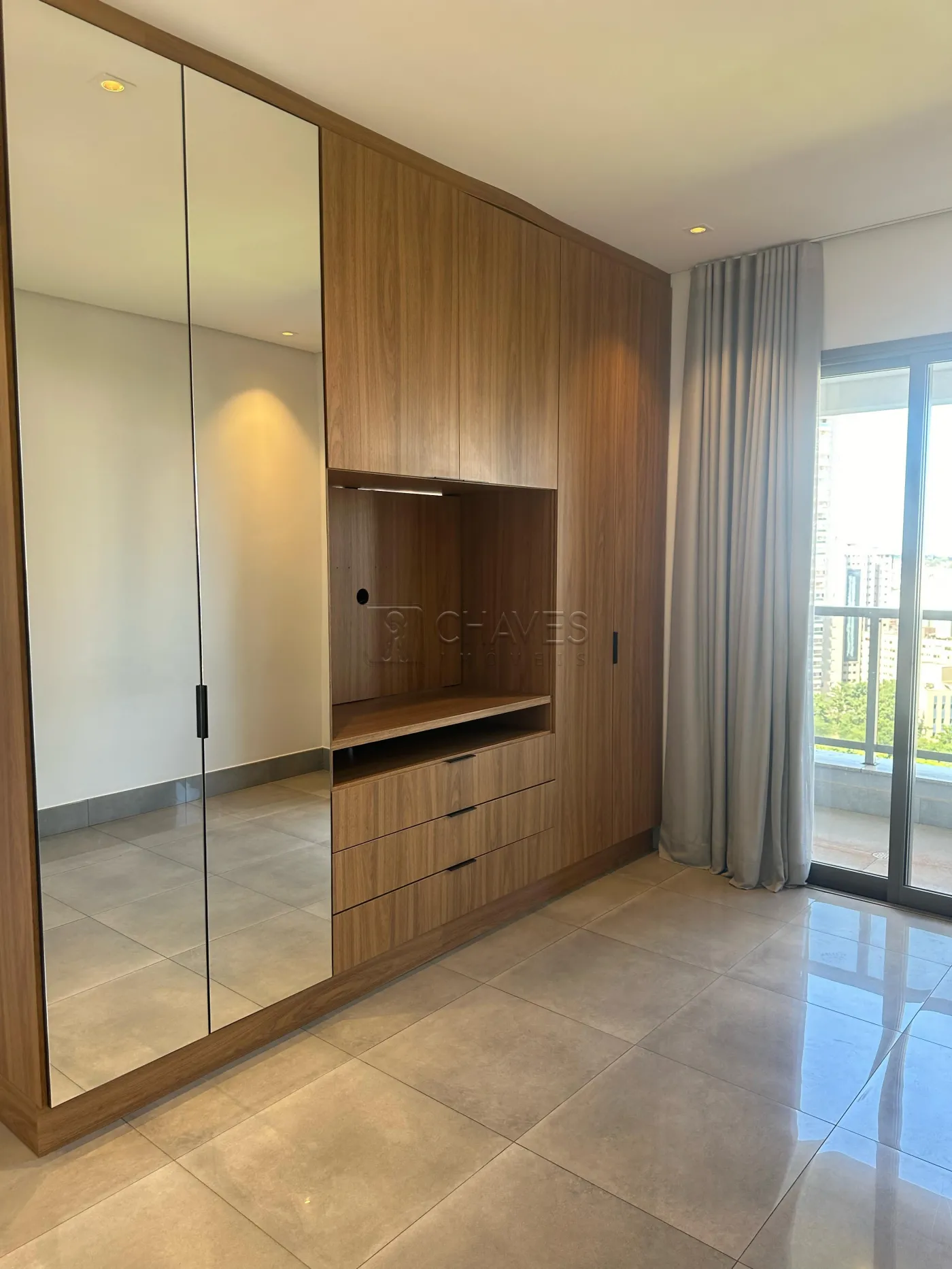 - 1 Suíte armário com espelho, cortina, ar condicionado.