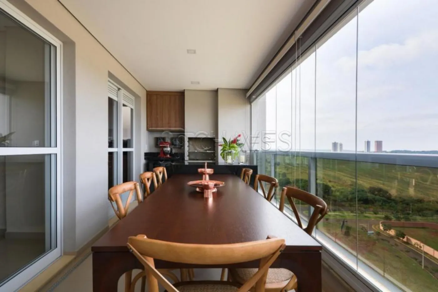 -Ampla varanda gourmet com fechamento total de vidro, 05 ar condicionados (nas 3 suítes, na sala e varanda)